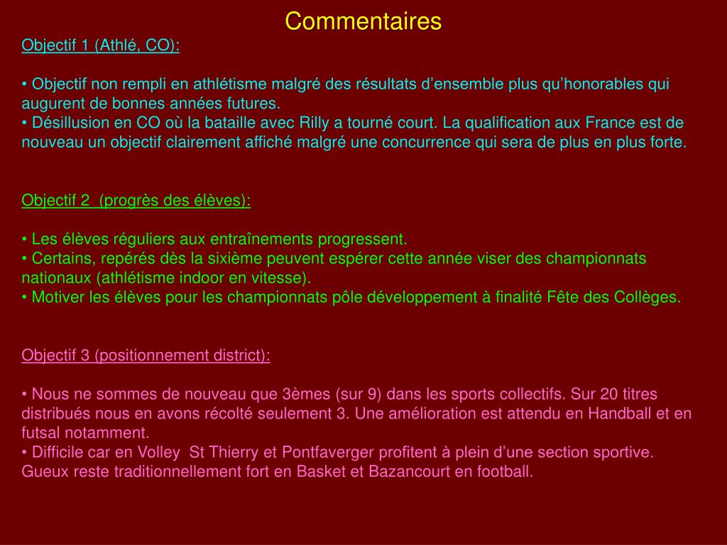Commentaires • Objectif 1 (Athlé, CO): • Objectif non rempli en athlétisme malgré des résultats d’ensemble plus qu’honorables qui augurent de bonnes années futures. • Désillusion en CO où la bataille avec Rilly a tourné court. La qualification aux France est de nouveau un objectif clairement affiché malgré une concurrence qui sera de plus en plus forte. • Objectif 2 (progrès des élèves): • Les élèves réguliers aux entraînements progressent. • Certains, repérés dès la sixième peuvent espérer cette année viser des championnats nationaux (athlétisme indoor en vitesse). • Motiver les élèves pour les championnats pôle développement à finalité Fête des Collèges. • Objectif 3 (positionnement district): • Nous ne sommes de nouveau que 3èmes (sur 9) dans les sports collectifs. Sur 20 titres distribués nous en avons récolté seulement 3. Une amélioration est attendu en Handball et en futsal notamment. • Difficile car en Volley St Thierry et Pontfaverger profitent à plein d’une section sportive. Gueux reste traditionnellement fort en Basket et Bazancourt en football.