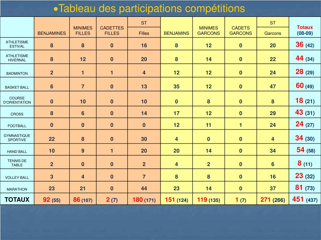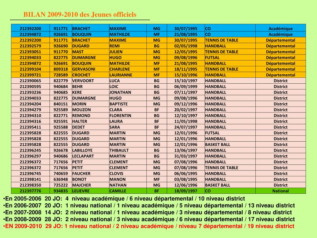 En 2005-2006 20 JO: 4 niveau académique / 6 niveau départemental / 10 niveau district • En 2006-2007 20 JO: 1 niveau national / 1 niveau académique / 5 niveau départemental / 13 niveau district • En 2007-2008 14 JO: 2 niveau national / 1 niveau académique / 3 niveau départemental / 8 niveau district • En 2008-2009 28 JO: 2 niveau national / 3 niveau académique / 6 niveau départemental / 17 niveau district • EN 2009-2010 29 JO: 1 niveau national / 2 niveau académique / niveau 7 départemental / 19 niveau district