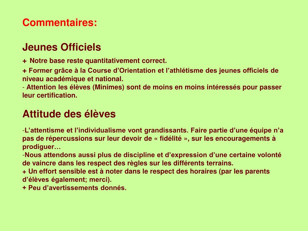 Commentaires: • Jeunes Officiels • +Notre base reste quantitativement correct. • + Former grâce à la Course d’Orientation et l’athlétisme des jeunes officiels de niveau académique et national. • Attention les élèves (Minimes) sont de moins en moins intéressés pour passer leur certification. • Attitude des élèves • L’attentisme et l’individualisme vont grandissants. Faire partie d’une équipe n’a pas de répercussions sur leur devoir de « fidélité », sur les encouragements à prodiguer… • Nous attendons aussi plus de discipline et d’expression d’une certaine volonté de vaincre dans les respect des règles sur les différents terrains. • + Un effort sensible est à noter dans le respect des horaires (par les parents d’élèves également; merci). • + Peu d’avertissements donnés.
