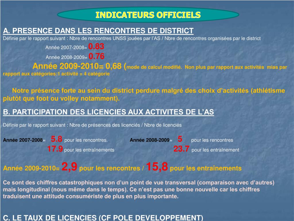 INDICATEURS OFFICIELS • A. PRESENCE DANS LES RENCONTRES DE DISTRICT Définie par le rapport suivant : Nbre de rencontres UNSS jouées par l’AS /Nbrede rencontres organisées par le district • Année 2007-2008= 0.83 • Année 2008-2009= 0.76 • Année 2009-2010= 0,68 (mode de calcul modifié. Non plus par rapport aux activités mias par rapport aux catégories:1 activité = 4 catégorie • Notre présence forte au sein du district perdure malgré des choix d’activités (athlétisme plutôt que foot ou volley notamment). • B. PARTICIPATION DES LICENCIES AUX ACTIVITES DE L’AS Définie par le rapport suivant : Nbre de présences des licenciés / Nbre de licenciés • Année 2007-2008= 5.8pour les rencontres.Année 2008-2009= 5 pour les rencontres 17.9 pour les entraînements 23.7pour les entraînement Année 2009-2010= 2,9 pour les rencontres / 15,8 pour les entraînements • Ce sont des chiffres catastrophiques non d’un point de vue transversal (comparaison avec d’autres) mais longitudinal (nous même dans le temps). Ce n’est pas une bonne nouvelle car les chiffres traduisent une attitude consumériste de plus en plus importante. • C. LE TAUX DE LICENCIES (CF POLE DEVELOPPEMENT)