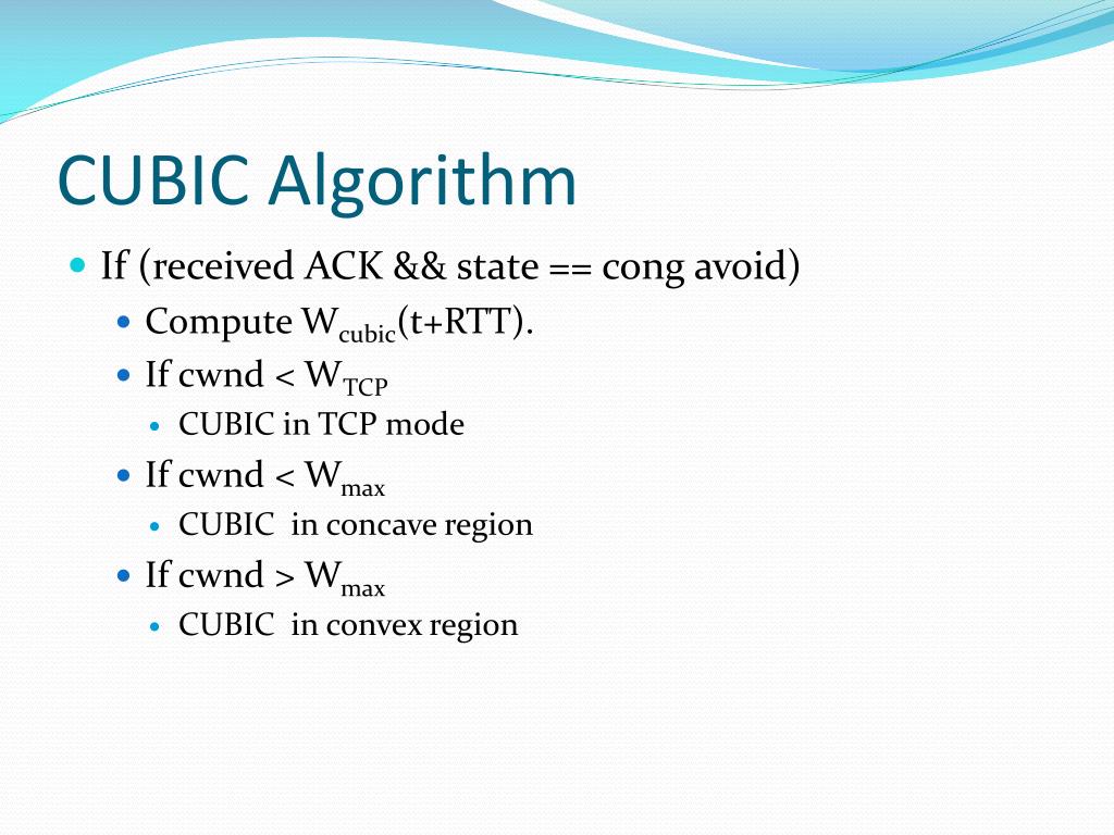 CUBIC Algorithm • If (received ACK && state == cong avoid) • Compute Wcubic(t+RTT). • If cwnd < WTCP • CUBIC in TCP mode • If cwnd < Wmax • CUBIC in concave region • If cwnd > Wmax • CUBIC in convex region