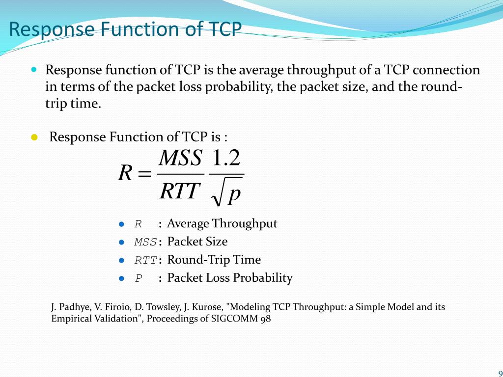 Response Function of TCP is : • R : Average Throughput • MSS: Packet Size • RTT: Round-Trip Time • P : Packet Loss Probability J. Padhye, V. Firoio, D. Towsley, J. Kurose, "Modeling TCP Throughput: a Simple Model and its Empirical Validation", Proceedings of SIGCOMM 98 Response Function of TCP • Response function of TCP is the average throughput of a TCP connection in terms of the packet loss probability, the packet size, and the round-trip time.