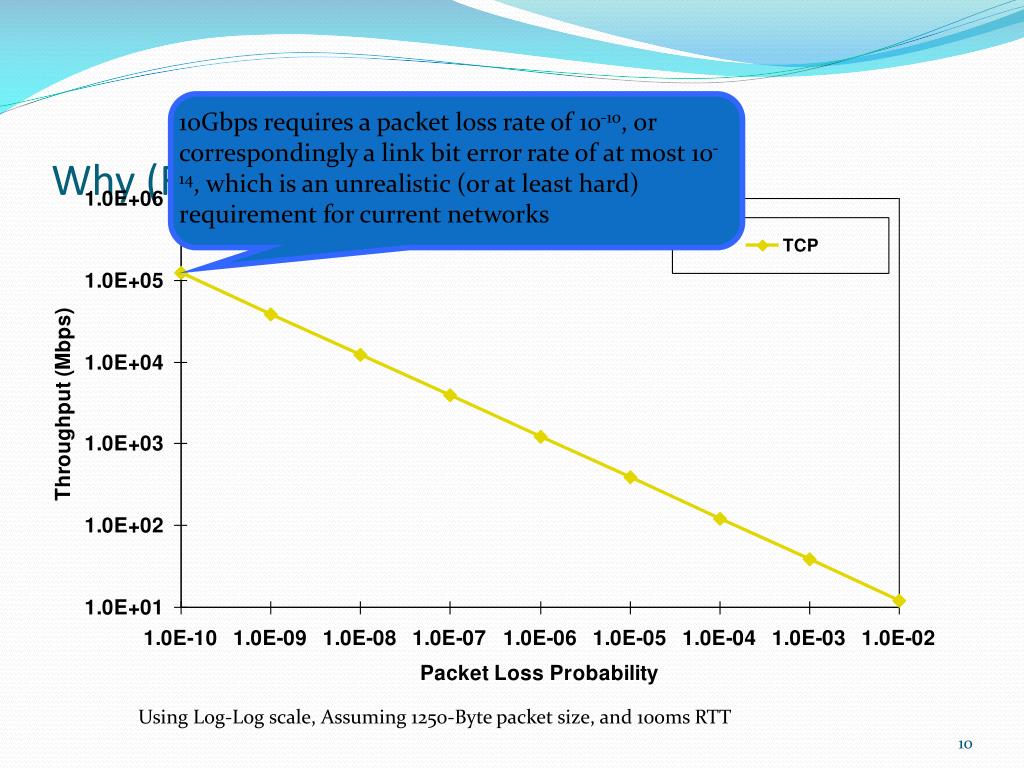 Why (Response Function of TCP) 10Gbps requires a packet loss rate of 10-10, or correspondingly a link bit error rate of at most 10-14, which is an unrealistic (or at least hard) requirement for current networks Using Log-Log scale, Assuming 1250-Byte packet size, and 100ms RTT