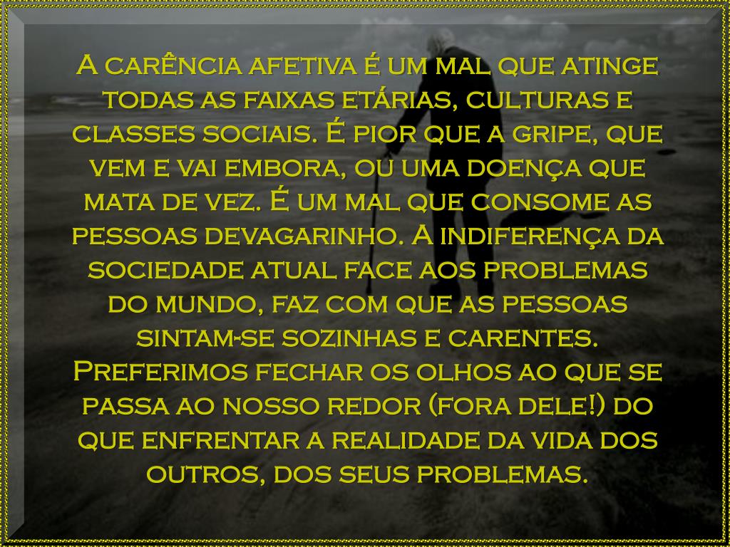 A carência afetiva é um mal que atinge todas as faixas etárias, culturas e classes sociais. É pior que a gripe, que vem e vai embora, ou uma doença que mata de vez. É um mal que consome as pessoas devagarinho. A indiferença da sociedade atual face aos problemas do mundo, faz com que as pessoas sintam-se sozinhas e carentes. Preferimos fechar os olhos ao que se passa ao nosso redor (fora dele!) do que enfrentar a realidade da vida dos outros, dos seus problemas.