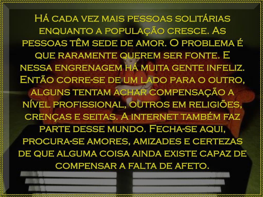 Há cada vez mais pessoas solitárias enquanto a população cresce. As pessoas têm sede de amor. O problema é que raramente querem ser fonte. E nessa engrenagem há muita gente infeliz. Então corre-se de um lado para o outro, alguns tentam achar compensação a nível profissional, outros em religiões, crenças e seitas. A internet também faz parte desse mundo. Fecha-se aqui, procura-se amores, amizades e certezas de que alguma coisa ainda existe capaz de compensar a falta de afeto.