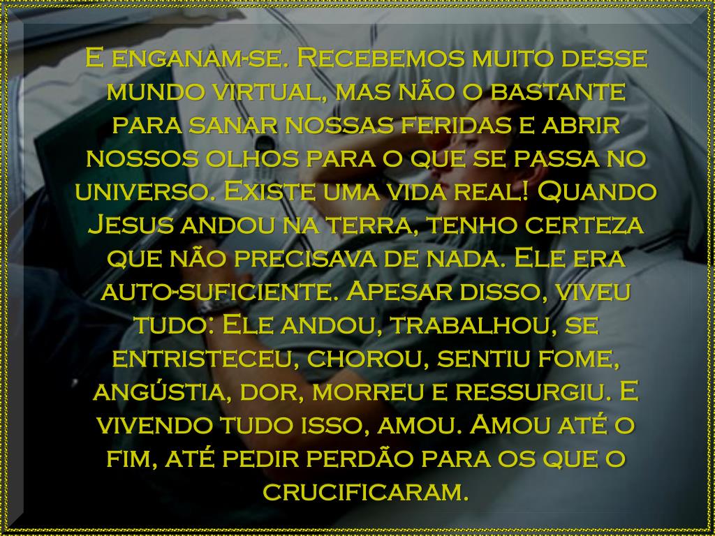 E enganam-se. Recebemos muito desse mundo virtual, mas não o bastante para sanar nossas feridas e abrir nossos olhos para o que se passa no universo. Existe uma vida real! Quando Jesus andou na terra, tenho certeza que não precisava de nada. Ele era auto-suficiente. Apesar disso, viveu tudo: Ele andou, trabalhou, se entristeceu, chorou, sentiu fome, angústia, dor, morreu e ressurgiu. E vivendo tudo isso, amou. Amou até o fim, até pedir perdão para os que o crucificaram.