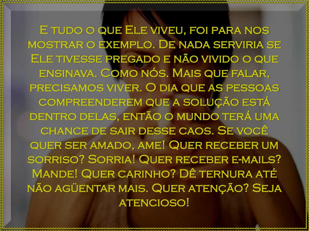 E tudo o que Ele viveu, foi para nos mostrar o exemplo. De nada serviria se Ele tivesse pregado e não vivido o que ensinava. Como nós. Mais que falar, precisamos viver. O dia que as pessoas compreenderem que a solução está dentro delas, então o mundo terá uma chance de sair desse caos. Se você quer ser amado, ame! Quer receber um sorriso? Sorria! Quer receber e-mails? Mande! Quer carinho? Dê ternura até não agüentar mais. Quer atenção? Seja atencioso!