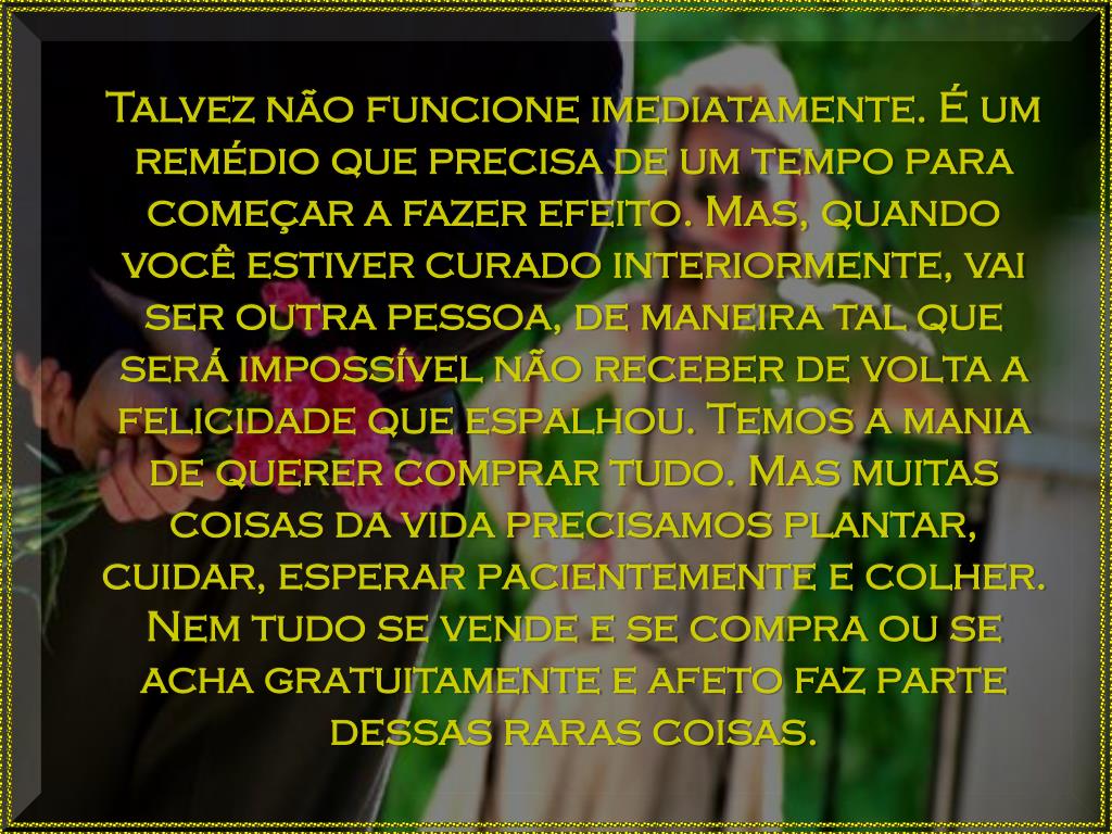 Talvez não funcione imediatamente. É um remédio que precisa de um tempo para começar a fazer efeito. Mas, quando você estiver curado interiormente, vai ser outra pessoa, de maneira tal que será impossível não receber de volta a felicidade que espalhou. Temos a mania de querer comprar tudo. Mas muitas coisas da vida precisamos plantar, cuidar, esperar pacientemente e colher. Nem tudo se vende e se compra ou se acha gratuitamente e afeto faz parte dessas raras coisas.