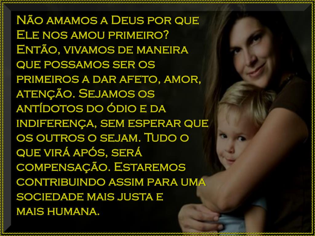 Não amamos a Deus por que Ele nos amou primeiro? Então, vivamos de maneira que possamos ser os primeiros a dar afeto, amor, atenção. Sejamos os antídotos do ódio e da indiferença, sem esperar que os outros o sejam. Tudo o que virá após, será compensação. Estaremos contribuindo assim para uma sociedade mais justa e mais humana.