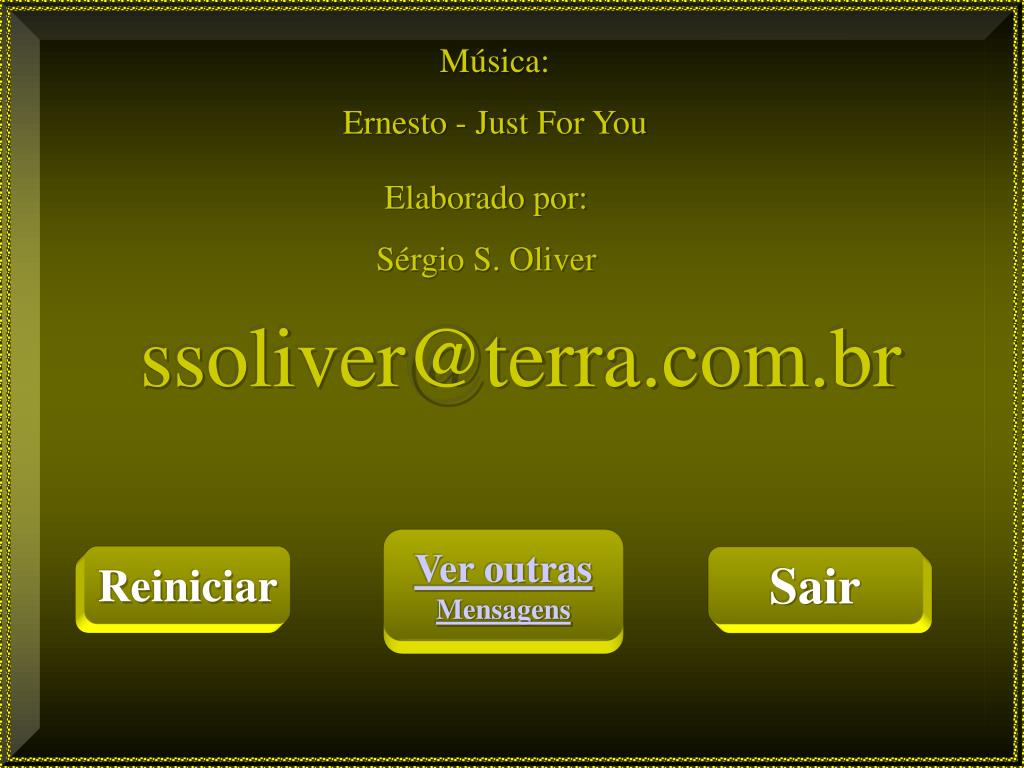 Música: Ernesto - Just For You Elaborado por: Sérgio S. Oliver ssoliver@terra.com.br Ver outras Mensagens Reiniciar Sair