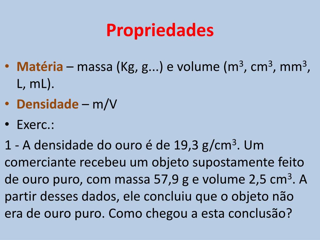 Propriedades • Matéria – massa (Kg, g...) e volume (m3, cm3, mm3, L, mL). • Densidade – m/V • Exerc.: 1 - A densidade do ouro é de 19,3 g/cm3. Um comerciante recebeu um objeto supostamente feito de ouro puro, com massa 57,9 g e volume 2,5 cm3. A partir desses dados, ele concluiu que o objeto não era de ouro puro. Como chegou a esta conclusão?