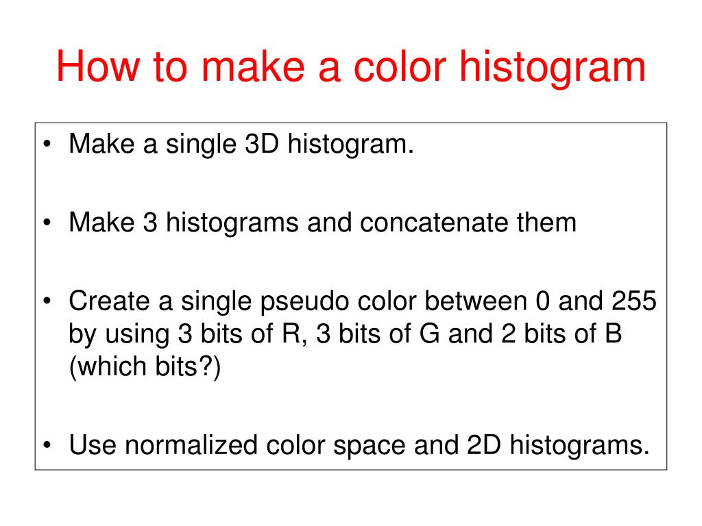 How to make a color histogram • Make a single 3D histogram. • Make 3 histograms and concatenate them • Create a single pseudo color between 0 and 255 by using 3 bits of R, 3 bits of G and 2 bits of B (which bits?) • Use normalized color space and 2D histograms.