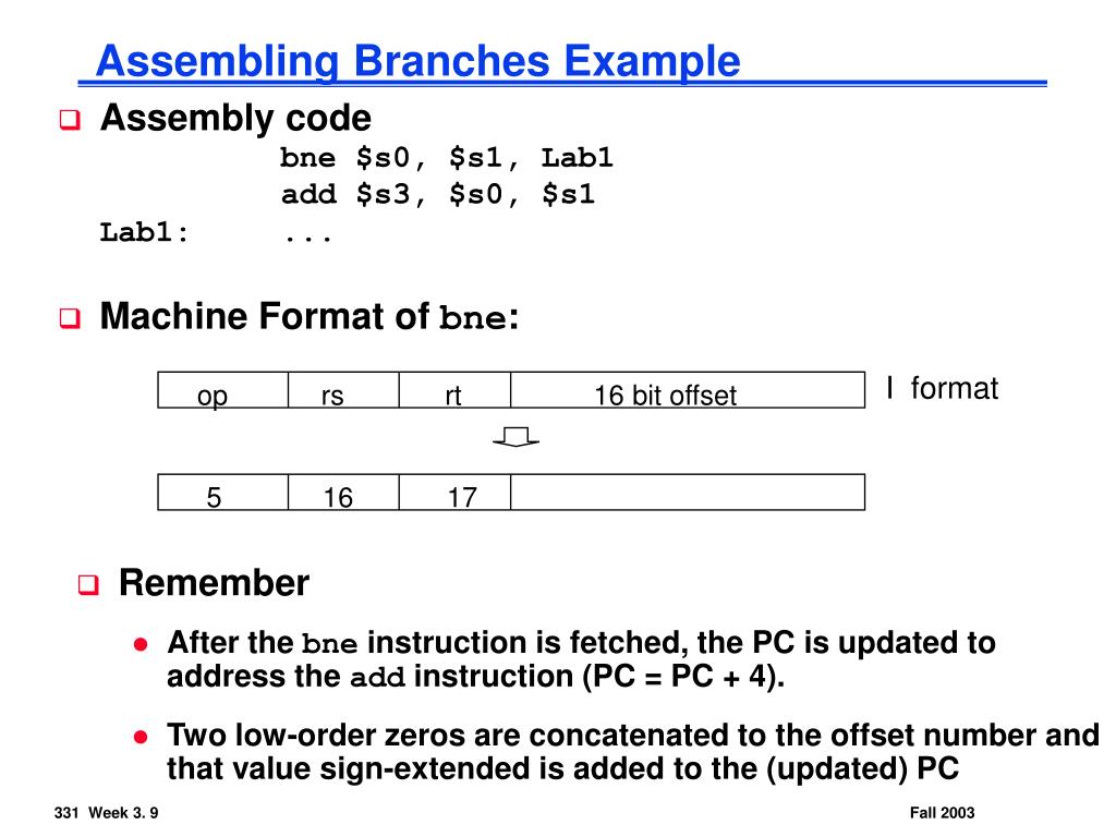op rs rt 16 bit offset Assembling Branches Example • Assembly code bne $s0, $s1, Lab1 add $s3, $s0, $s1Lab1: ... • Machine Format of bne: I format 5 16 17 • Remember • After the bne instruction is fetched, the PC is updated to address the add instruction (PC = PC + 4). • Two low-order zeros are concatenated to the offset number and that value sign-extended is added to the (updated) PC