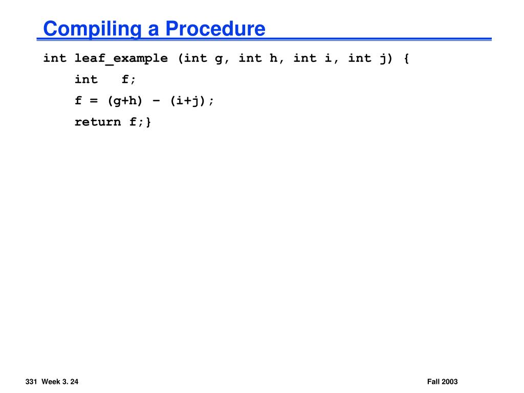 Compiling a Procedure int leaf_example (int g, int h, int i, int j) { int f; f = (g+h) – (i+j); return f;}