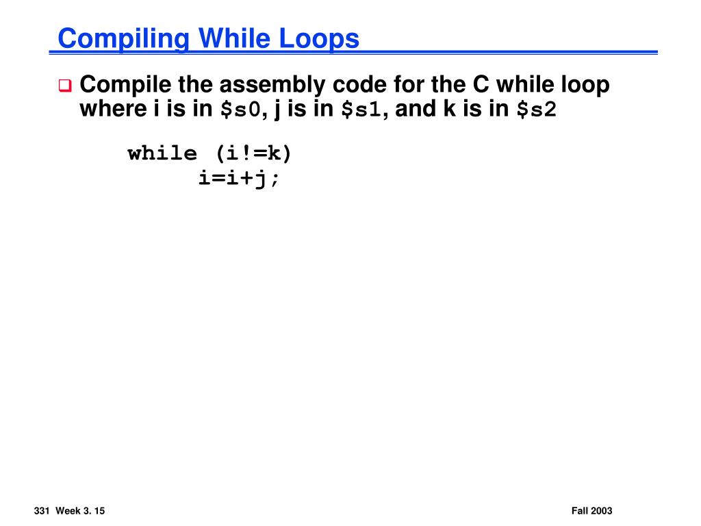 Compiling While Loops • Compile the assembly code for the C while loop where i is in $s0, j is in $s1, and k is in $s2 while (i!=k) i=i+j;