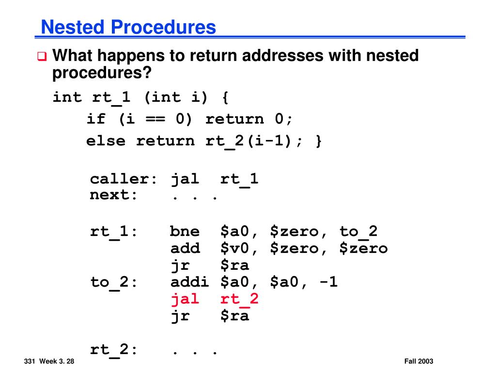 Nested Procedures • What happens to return addresses with nested procedures? int rt_1 (int i) { if (i == 0) return 0; else return rt_2(i-1); } caller: jal rt_1next: . . . rt_1: bne $a0, $zero, to_2 add $v0, $zero, $zero jr $ra to_2: addi $a0, $a0, -1 jal rt_2 jr $ra rt_2: . . .