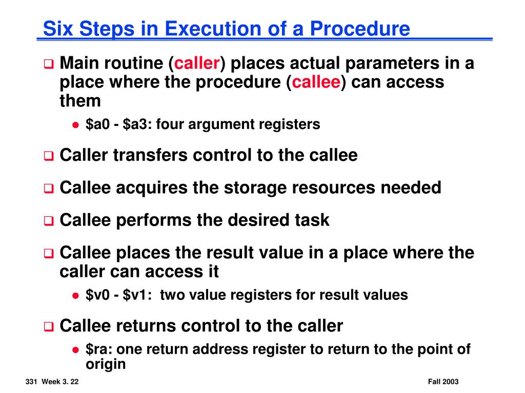 Six Steps in Execution of a Procedure • Main routine (caller) places actual parameters in a place where the procedure (callee) can access them • $a0 - $a3: four argument registers • Caller transfers control to the callee • Callee acquires the storage resources needed • Callee performs the desired task • Callee places the result value in a place where the caller can access it • $v0 - $v1: two value registers for result values • Callee returns control to the caller • $ra: one return address register to return to the point of origin