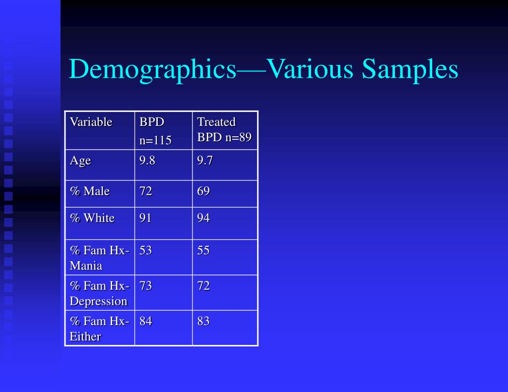 Questions 1. Does MFPG work for BPD? Bipolar Subsample Immediate Treatment Group=55 Waitlist Group=60 2. How does MFPG work for just those families who actually receive it (ie, those who complete treatment) Bipolar Subsample Immediate treatment group=54 (lose 1) Waitlist control group=35 (lose 25)