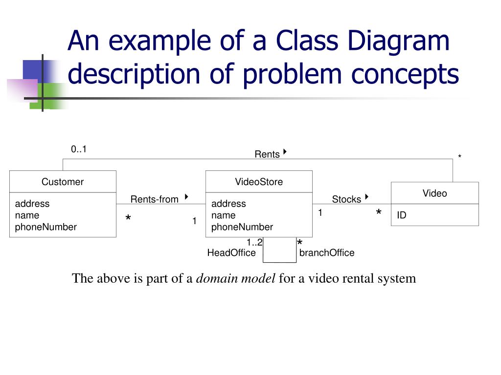 An example of a Class Diagram description of problem concepts 0..1 4 Rents * Customer VideoStore Video 4 4 Rents-from Stocks address address * 1 name name ID * 1 phoneNumber phoneNumber * 1..2 HeadOffice branchOffice The above is part of a domain model for a video rental system