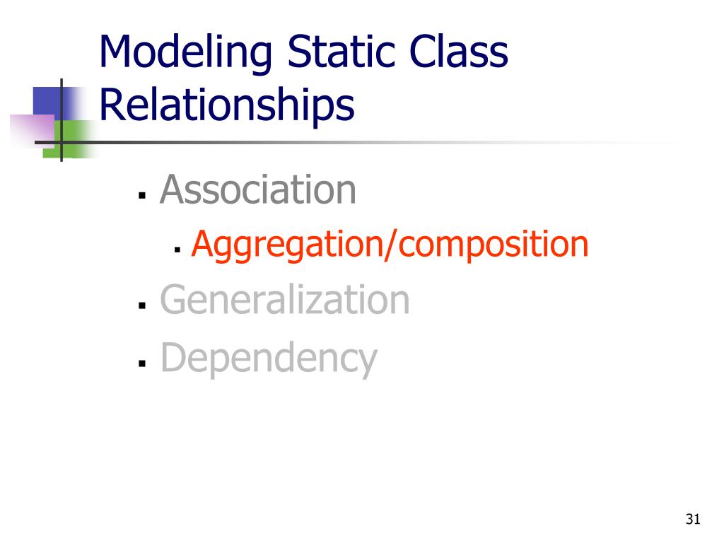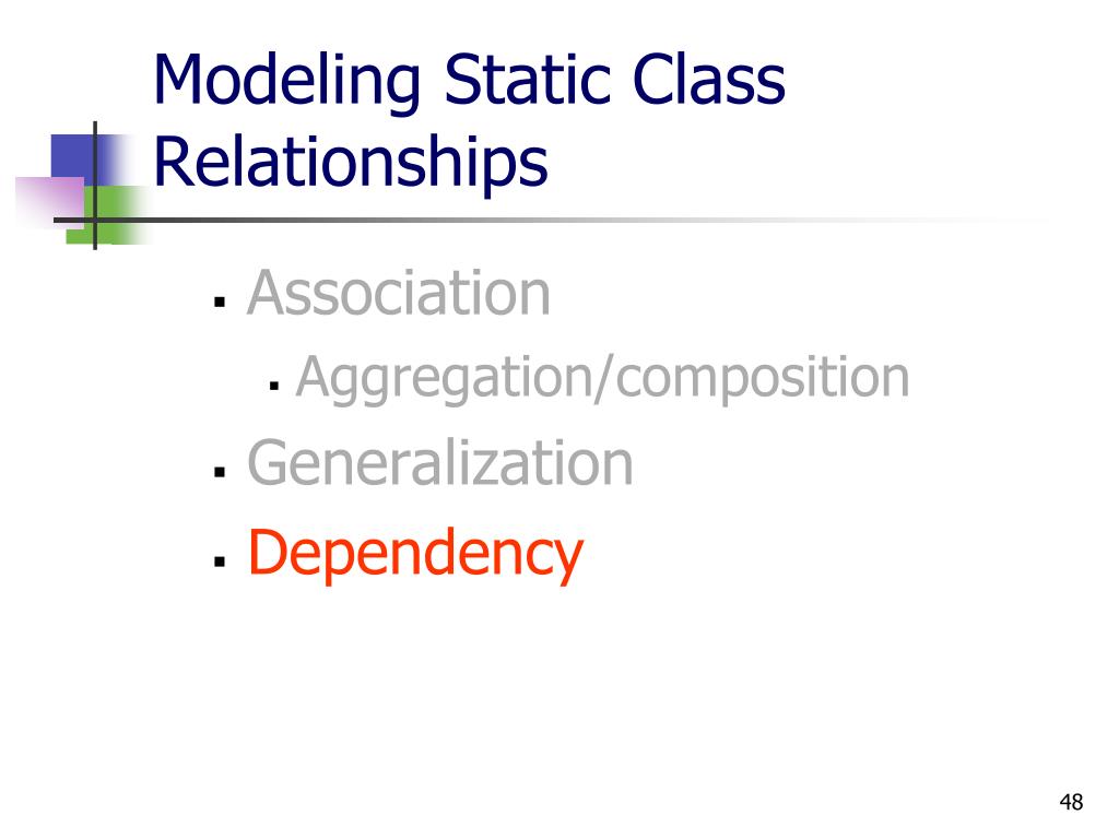 Modeling Static Class Relationships • Association • Aggregation/composition • Generalization • Dependency