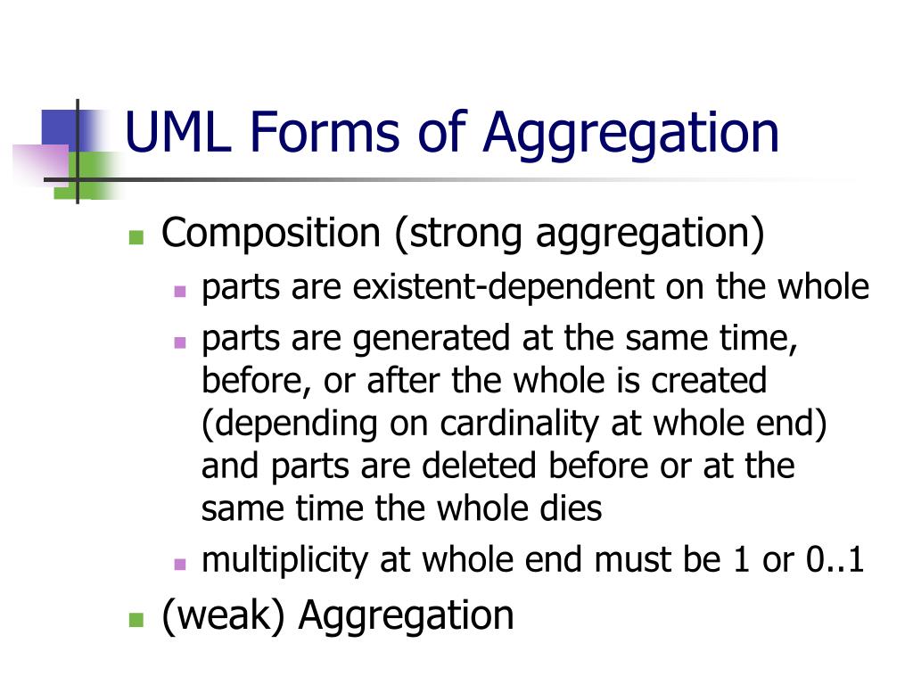 UML Forms of Aggregation • Composition (strong aggregation) • parts are existent-dependent on the whole • parts are generated at the same time, before, or after the whole is created (depending on cardinality at whole end) and parts are deleted before or at the same time the whole dies • multiplicity at whole end must be 1 or 0..1 • (weak) Aggregation