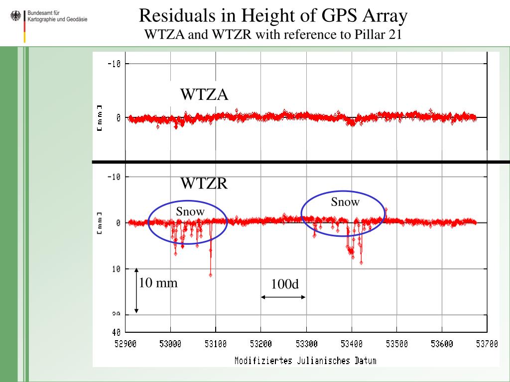 Residuals in Height of GPS ArrayWTZA and WTZR with reference to Pillar 21 WTZA WTZR Snow Snow Snow 10 mm 100d