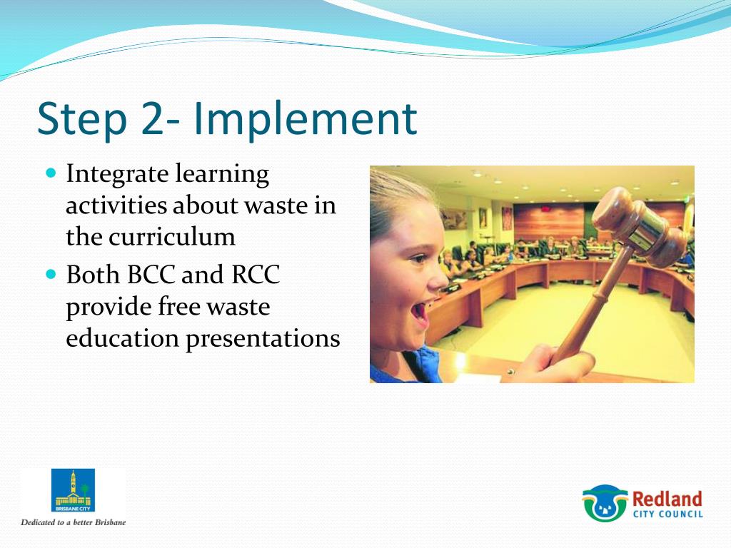 Step 2- Implement • Integrate learning activities about waste in the curriculum • Both BCC and RCC provide free waste education presentations