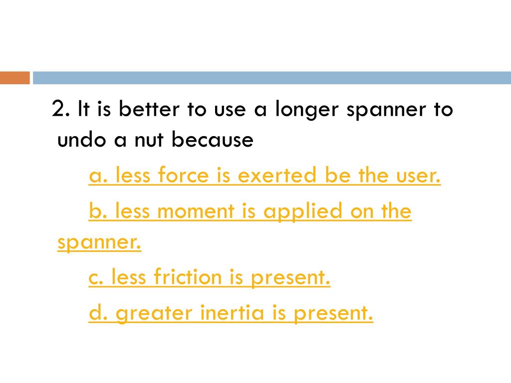 2. It is better to use a longer spanner to undo a nut because a. less force is exerted be the user. b. less moment is applied on the spanner. c. less friction is present. d. greater inertia is present.