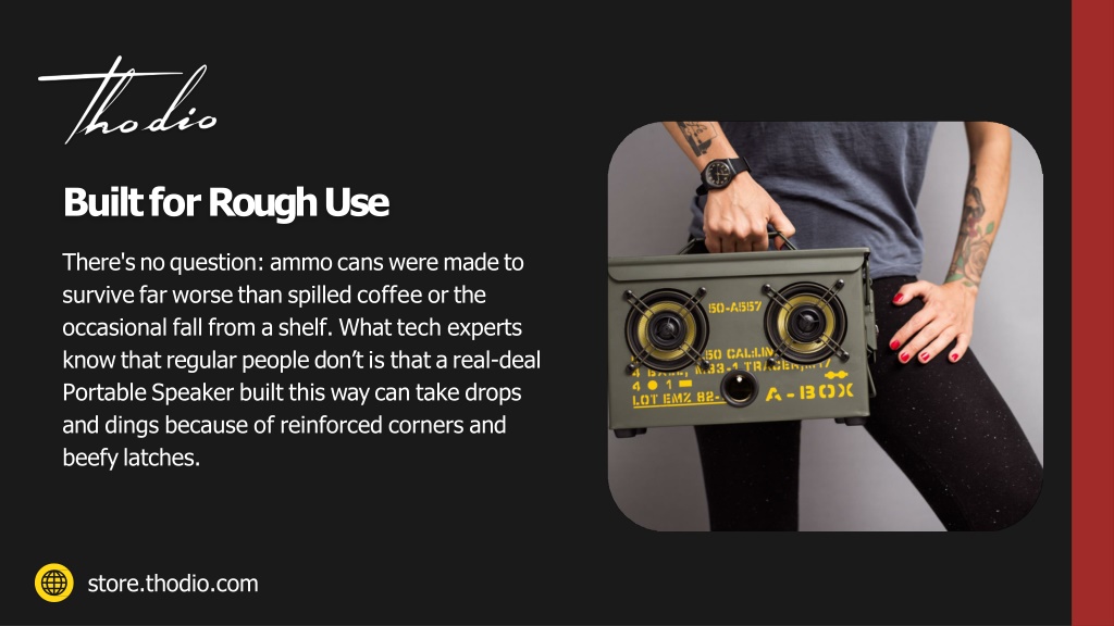 7. BuiltforRoughUse There'snoquestion:ammocansweremadeto survivefarworsethanspilledcoffeeorthe occasionalfallfromashelf.Whattechexperts knowthatregularpeopledon’tisthatareal-deal PortableSpeakerbuiltthiswaycantakedrops anddingsbecauseofreinforcedcornersand beefylatches. store.thodio.com