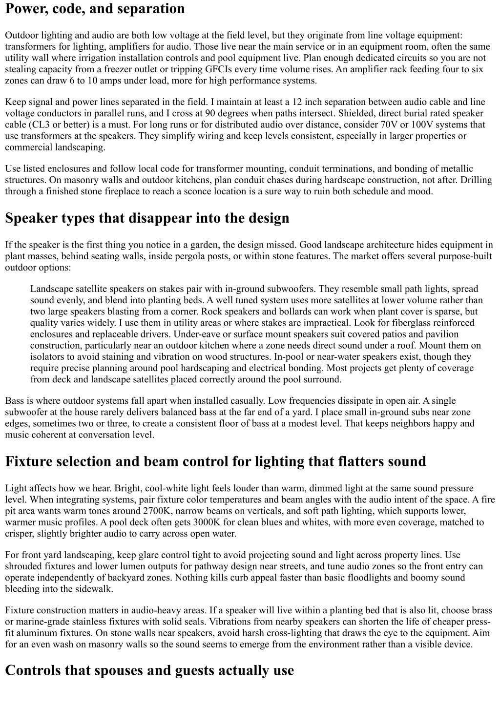 Power, code, and separation Outdoor lighting and audio are both low voltage at the field level, but they originate from line voltage equipment: transformers for lighting, amplifiers for audio. Those live near the main service or in an equipment room, often the same utility wall where irrigation installation controls and pool equipment live. Plan enough dedicated circuits so you are not stealing capacity from a freezer outlet or tripping GFCIs every time volume rises. An amplifier rack feeding four to six zones can draw 6 to 10 amps under load, more for high performance systems. Keep signal and power lines separated in the field. I maintain at least a 12 inch separation between audio cable and line voltage conductors in parallel runs, and I cross at 90 degrees when paths intersect. Shielded, direct burial rated speaker cable (CL3 or better) is a must. For long runs or for distributed audio over distance, consider 70V or 100V systems that use transformers at the speakers. They simplify wiring and keep levels consistent, especially in larger properties or commercial landscaping. Use listed enclosures and follow local code for transformer mounting, conduit terminations, and bonding of metallic structures. On masonry walls and outdoor kitchens, plan conduit chases during hardscape construction, not after. Drilling through a finished stone fireplace to reach a sconce location is a sure way to ruin both schedule and mood. Speaker types that disappear into the design If the speaker is the first thing you notice in a garden, the design missed. Good landscape architecture hides equipment in plant masses, behind seating walls, inside pergola posts, or within stone features. The market offers several purpose-built outdoor options: Landscape satellite speakers on stakes pair with in-ground subwoofers. They resemble small path lights, spread sound evenly, and blend into planting beds. A well tuned system uses more satellites at lower volume rather than two large speakers blasting from a corner. Rock speakers and bollards can work when plant cover is sparse, but quality varies widely. I use them in utility areas or where stakes are impractical. Look for fiberglass reinforced enclosures and replaceable drivers. Under-eave or surface mount speakers suit covered patios and pavilion construction, particularly near an outdoor kitchen where a zone needs direct sound under a roof. Mount them on isolators to avoid staining and vibration on wood structures. In-pool or near-water speakers exist, though they require precise planning around pool hardscaping and electrical bonding. Most projects get plenty of coverage from deck and landscape satellites placed correctly around the pool surround. Bass is where outdoor systems fall apart when installed casually. Low frequencies dissipate in open air. A single subwoofer at the house rarely delivers balanced bass at the far end of a yard. I place small in-ground subs near zone edges, sometimes two or three, to create a consistent floor of bass at a modest level. That keeps neighbors happy and music coherent at conversation level. Fixture selection and beam control for lighting that flatters sound Light affects how we hear. Bright, cool-white light feels louder than warm, dimmed light at the same sound pressure level. When integrating systems, pair fixture color temperatures and beam angles with the audio intent of the space. A fire pit area wants warm tones around 2700K, narrow beams on verticals, and soft path lighting, which supports lower, warmer music profiles. A pool deck often gets 3000K for clean blues and whites, with more even coverage, matched to crisper, slightly brighter audio to carry across open water. For front yard landscaping, keep glare control tight to avoid projecting sound and light across property lines. Use shrouded fixtures and lower lumen outputs for pathway design near streets, and tune audio zones so the front entry can operate independently of backyard zones. Nothing kills curb appeal faster than basic floodlights and boomy sound bleeding into the sidewalk. Fixture construction matters in audio-heavy areas. If a speaker will live within a planting bed that is also lit, choose brass or marine-grade stainless fixtures with solid seals. Vibrations from nearby speakers can shorten the life of cheaper press- fit aluminum fixtures. On stone walls near speakers, avoid harsh cross-lighting that draws the eye to the equipment. Aim for an even wash on masonry walls so the sound seems to emerge from the environment rather than a visible device. Controls that spouses and guests actually use