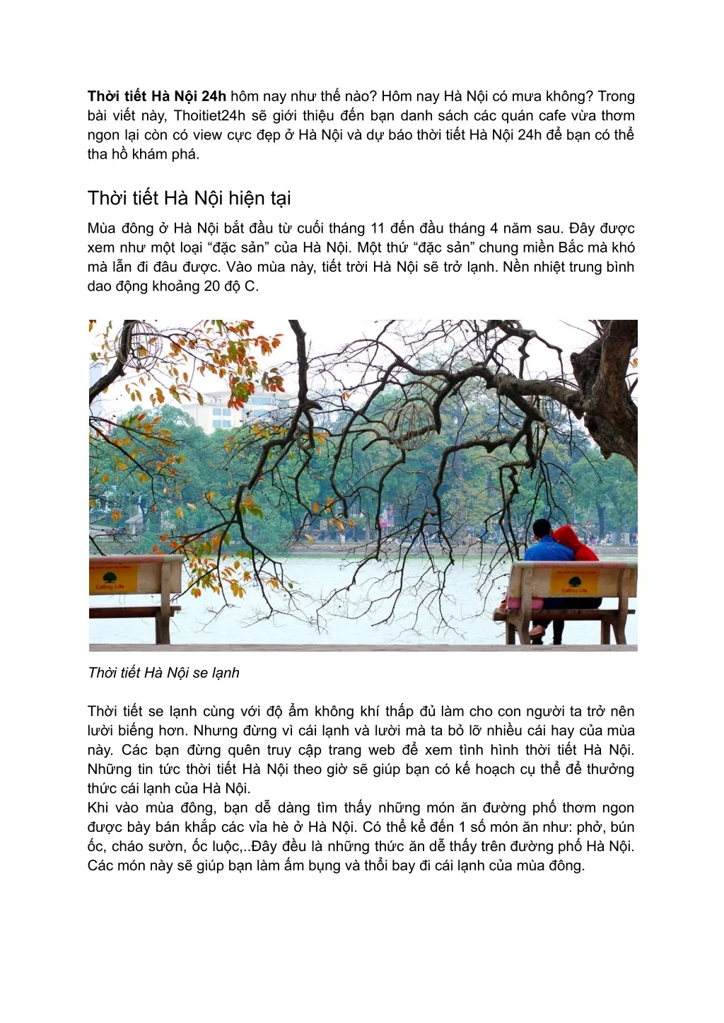 Thời tiết Hà Nội 24h hôm nay như thế nào? Hôm nay Hà Nội có mưa không? Trong bài viết này, Thoitiet24h sẽ giới thiệu đến bạn danh sách các quán cafe vừa thơm ngon lại còn có view cực đẹp ở Hà Nội và dự báo thời tiết Hà Nội 24h để bạn có thể tha hồ khám phá. Thời tiết Hà Nội hiện tại Mùa đông ở Hà Nội bắt đầu từ cuối tháng 11 đến đầu tháng 4 năm sau. Đây được xem như một loại “đặc sản” của Hà Nội. Một thứ “đặc sản” chung miền Bắc mà khó mà lẫn đi đâu được. Vào mùa này, tiết trời Hà Nội sẽ trở lạnh. Nền nhiệt trung bình dao động khoảng 20 độ C. Thời tiết Hà Nội se lạnh Thời tiết se lạnh cùng với độ ẩm không khí thấp đủ làm cho con người ta trở nên lười biếng hơn. Nhưng đừng vì cái lạnh và lười mà ta bỏ lỡ nhiều cái hay của mùa này. Các bạn đừng quên truy cập trang web để xem tình hình thời tiết Hà Nội. Những tin tức thời tiết Hà Nội theo giờ sẽ giúp bạn có kế hoạch cụ thể để thưởng thức cái lạnh của Hà Nội. Khi vào mùa đông, bạn dễ dàng tìm thấy những món ăn đường phố thơm ngon được bày bán khắp các vỉa hè ở Hà Nội. Có thể kể đến 1 số món ăn như: phở, bún ốc, cháo sườn, ốc luộc,..Đây đều là những thức ăn dễ thấy trên đường phố Hà Nội. Các món này sẽ giúp bạn làm ấm bụng và thổi bay đi cái lạnh của mùa đông.