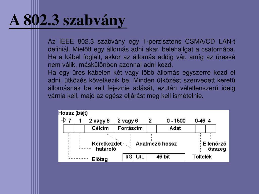 A 802.3 szabvány Az IEEE 802.3 szabvány egy 1-perzisztens CSMA/CD LAN-t definiál. Mielőtt egy állomás adni akar, belehallgat a csatornába. Ha a kábel foglalt, akkor az állomás addig vár, amíg az üressé nem válik, máskülönben azonnal adni kezd. Ha egy üres kábelen két vagy több állomás egyszerre kezd el adni, ütközés következik be. Minden ütközést szenvedett keretű állomásnak be kell fejeznie adását, ezután véletlenszerű ideig várnia kell, majd az egész eljárást meg kell ismételnie.