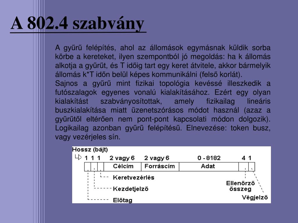 A 802.4 szabvány A gyűrű felépítés, ahol az állomások egymásnak küldik sorba körbe a kereteket, ilyen szempontból jó megoldás: ha k állomás alkotja a gyűrűt, és T időig tart egy keret átvitele, akkor bármelyik állomás k*T időn belül képes kommunikálni (felső korlát). Sajnos a gyűrű mint fizikai topológia kevéssé illeszkedik a futószalagok egyenes vonalú kialakításához. Ezért egy olyan kialakítást szabványosítottak, amely fizikailag lineáris buszkialakítása miatt üzenetszórásos módot használ (azaz a gyűrűtől eltérően nem pont-pont kapcsolati módon dolgozik). Logikailag azonban gyűrű felépítésű. Elnevezése: token busz, vagy vezérjeles sín.