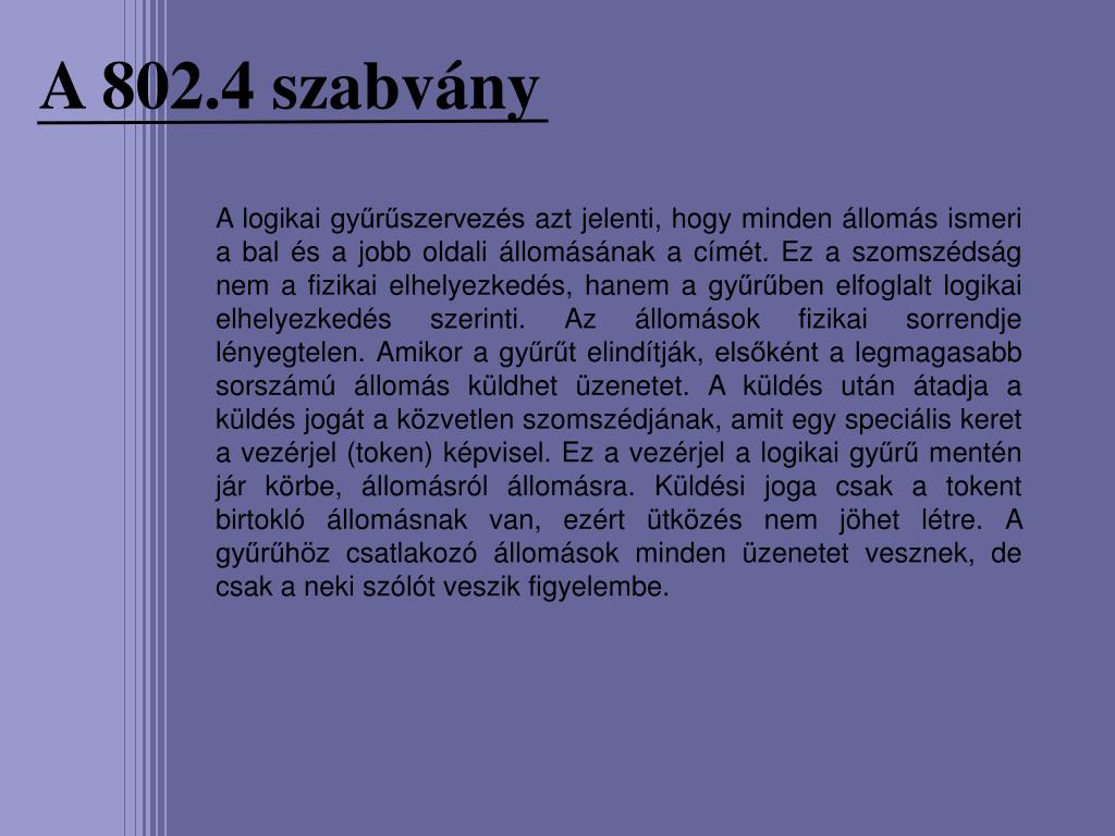 A 802.4 szabvány A logikai gyűrűszervezés azt jelenti, hogy minden állomás ismeri a bal és a jobb oldali állomásának a címét. Ez a szomszédság nem a fizikai elhelyezkedés, hanem a gyűrűben elfoglalt logikai elhelyezkedés szerinti. Az állomások fizikai sorrendje lényegtelen. Amikor a gyűrűt elindítják, elsőként a legmagasabb sorszámú állomás küldhet üzenetet. A küldés után átadja a küldés jogát a közvetlen szomszédjának, amit egy speciális keret a vezérjel (token) képvisel. Ez a vezérjel a logikai gyűrű mentén jár körbe, állomásról állomásra. Küldési joga csak a tokent birtokló állomásnak van, ezért ütközés nem jöhet létre. A gyűrűhöz csatlakozó állomások minden üzenetet vesznek, de csak a neki szólót veszik figyelembe.