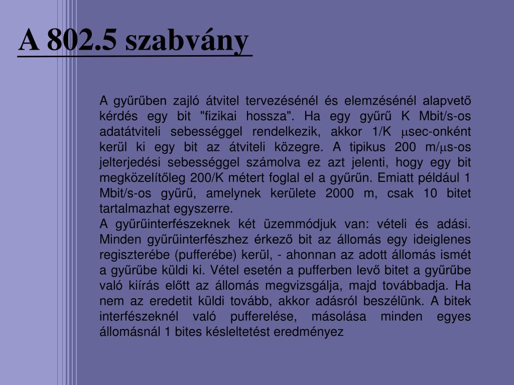 A 802.5 szabvány A gyűrű nem igazán alkalmas üzenetszórásos átvitelre, hiszen tulajdonképpen kör alakba rendezett, két pont közötti kapcsolatok halmaza. A gyűrűtechnológia majdnem teljesen digitális, szemben pl. a 802.3-al, amely jelentős mennyiségű analóg elemet tartalmaz az ütközések érzékeléséhez. A gyűrű kiszámítható felső időkorlátos csatorna-hozzáférést is biztosít. A létező többféle gyűrű kialakítások közül a 802.5 által szabványosítottat vezérjeles gyűrűnek (token ring) nevezik.