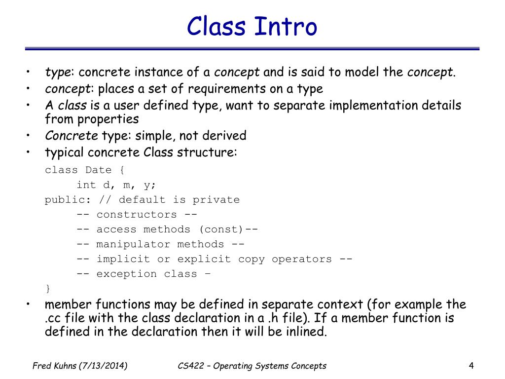 Class Intro • type: concrete instance of a concept and is said to model the concept. • concept: places a set of requirements on a type • A class is a user defined type, want to separate implementation details from properties • Concrete type: simple, not derived • typical concrete Class structure: class Date { int d, m, y; public: // default is private -- constructors -- -- access methods (const)-- -- manipulator methods -- -- implicit or explicit copy operators -- -- exception class – } • member functions may be defined in separate context (for example the .cc file with the class declaration in a .h file). If a member function is defined in the declaration then it will be inlined. CS422 – Operating Systems Concepts