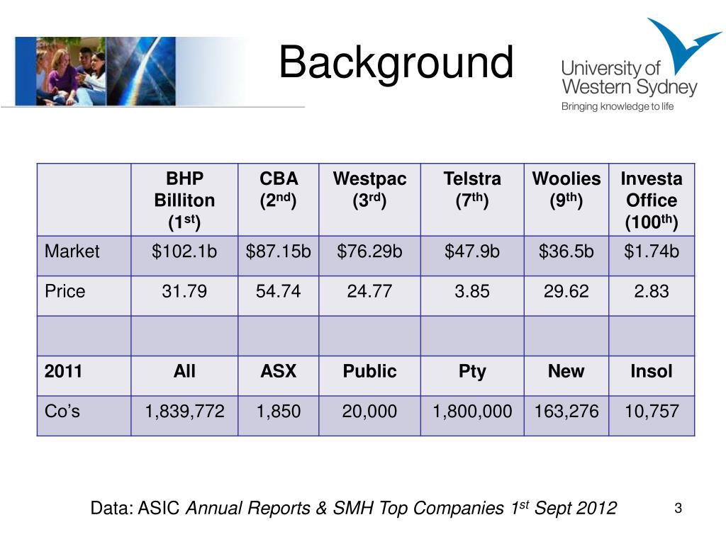 Background Data: ASIC Annual Reports & SMH Top Companies 1st Sept 2012