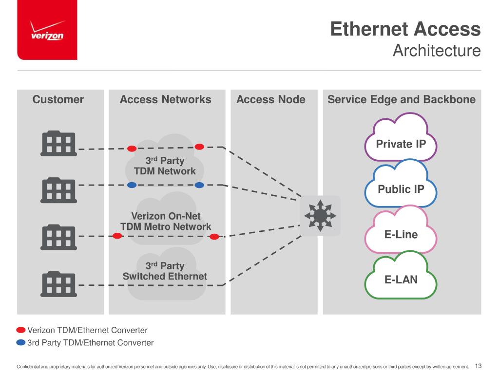 Ethernet AccessArchitecture Customer Access Networks Access Node Service Edge and Backbone Private IP 3rd Party TDM Network Public IP Verizon On-Net TDM Metro Network E-Line 3rd Party Switched Ethernet E-LAN Verizon TDM/Ethernet Converter 3rd Party TDM/Ethernet Converter