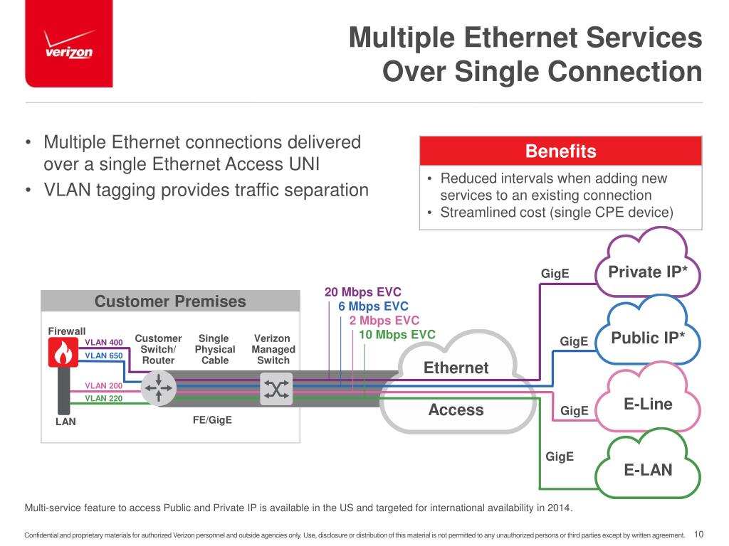 Multiple Ethernet Services Over Single Connection • Multiple Ethernet connections delivered over a single Ethernet Access UNI • VLAN tagging provides traffic separation Private IP* GigE 20 Mbps EVC Customer Premises 6 Mbps EVC 2 Mbps EVC Firewall 10 Mbps EVC Public IP* GigE Customer Switch/Router Single Physical Cable Verizon Managed Switch VLAN 400 VLAN 650 Ethernet VLAN 200 VLAN 220 E-Line GigE Access FE/GigE LAN GigE E-LAN Multi-service feature to access Public and Private IP is available in the US and targeted for international availability in 2014.