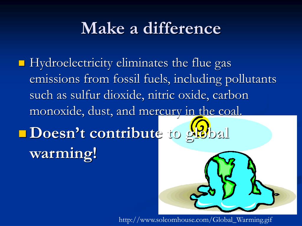 Make a difference • Hydroelectricity eliminates the flue gas emissions from fossil fuels, including pollutants such as sulfur dioxide, nitric oxide, carbon monoxide, dust, and mercury in the coal. • Doesn’t contribute to global warming! http://www.solcomhouse.com/Global_Warming.gif