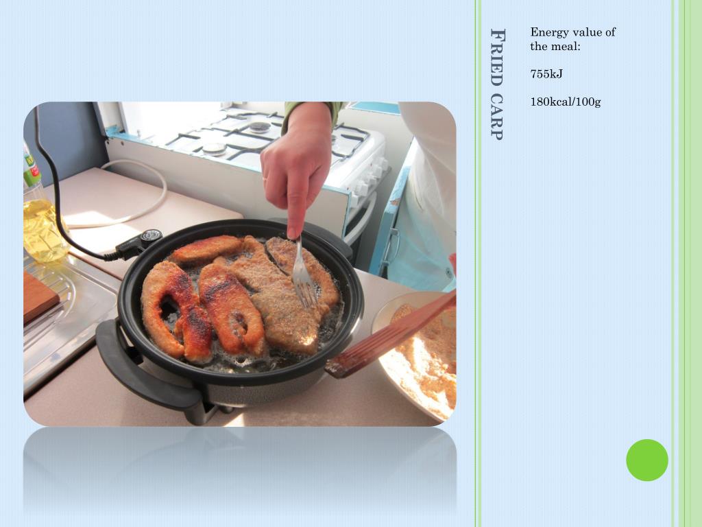 Energy value of themeal: 755kJ 180kcal/100g Friedcarp