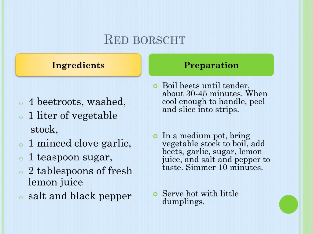 Red borscht Ingredients Preparation • 4 beetroots, washed, • 1 liter of vegetable stock, • 1 minced clove garlic, • 1 teaspoon sugar, • 2 tablespoons of fresh lemon juice • salt and black pepper • Boilbeets until tender, about 30-45 minutes. When cool enough to handle, peel and slice into strips. • In a medium pot, bring vegetablestock to boil, add beets, garlic, sugar, lemon juice, and salt and pepper to taste. Simmer 10 minutes. • Serve hot withlittledumplings.