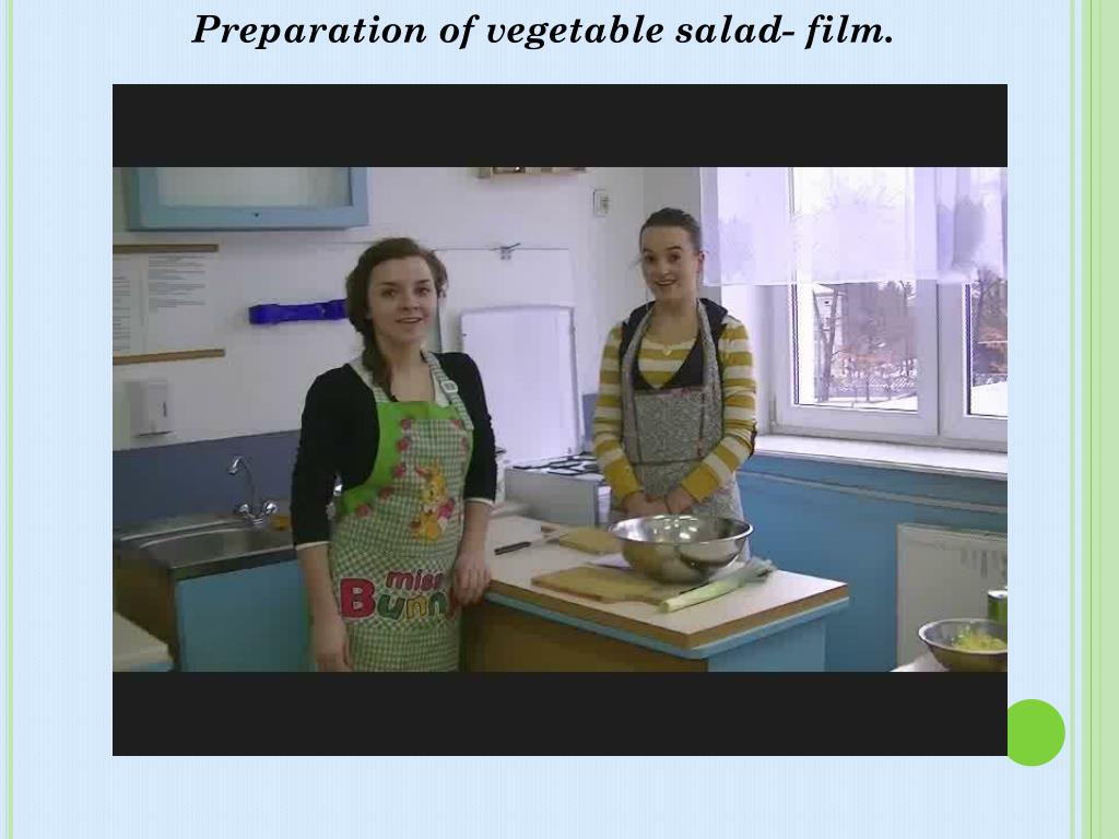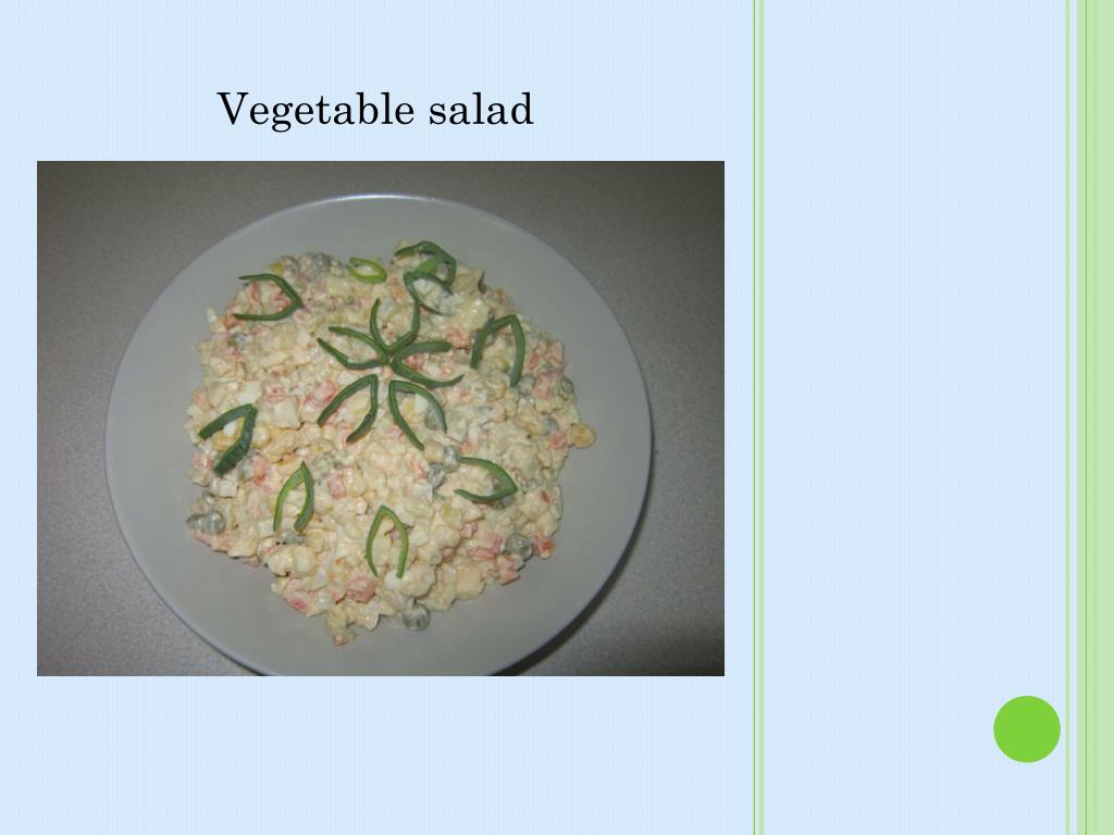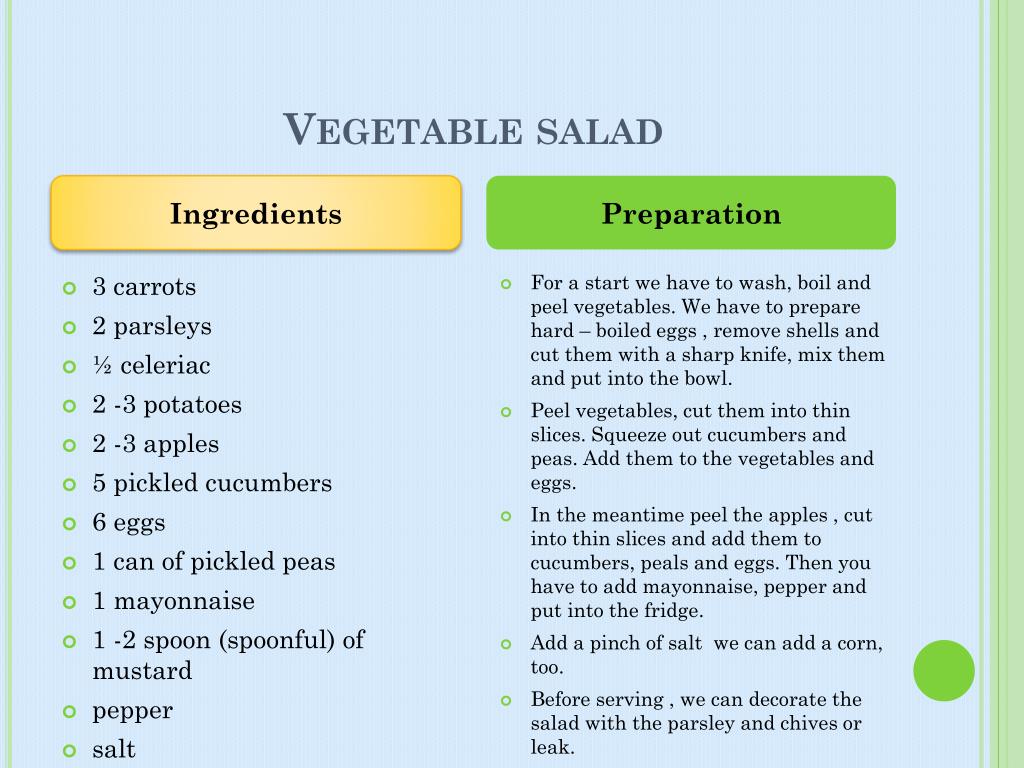 Vegetablesalad Ingredients Preparation • 3 carrots • 2 parsleys • ½ celeriac • 2 -3 potatoes • 2 -3 apples • 5 pickledcucumbers • 6 eggs • 1 can of pickledpeas • 1 mayonnaise • 1 -2 spoon (spoonful) of mustard • pepper • salt • For a start we have to wash, boil and peelvegetables. We have to preparehard – boiledeggs , removeshells and cutthemwith a sharpknife, mix them and putintothebowl. • Peelvegetables, cutthemintothinslices. Squeeze out cucumbers and peas. Addthem to thevegetables and eggs. • In themeantimepeeltheapples , cutintothinslices and addthem to cucumbers, peals and eggs. Thenyouhave to addmayonnaise, pepper and putintothefridge. • Add a pinch of salt we canadd a corn, too. • Beforeserving , we candecoratethesaladwiththeparsley and chivesorleak.