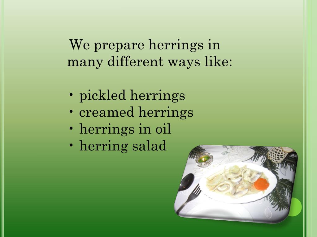 We prepare herrings in many different ways like: • pickled herrings• creamed herrings• herrings in oil• herring salad