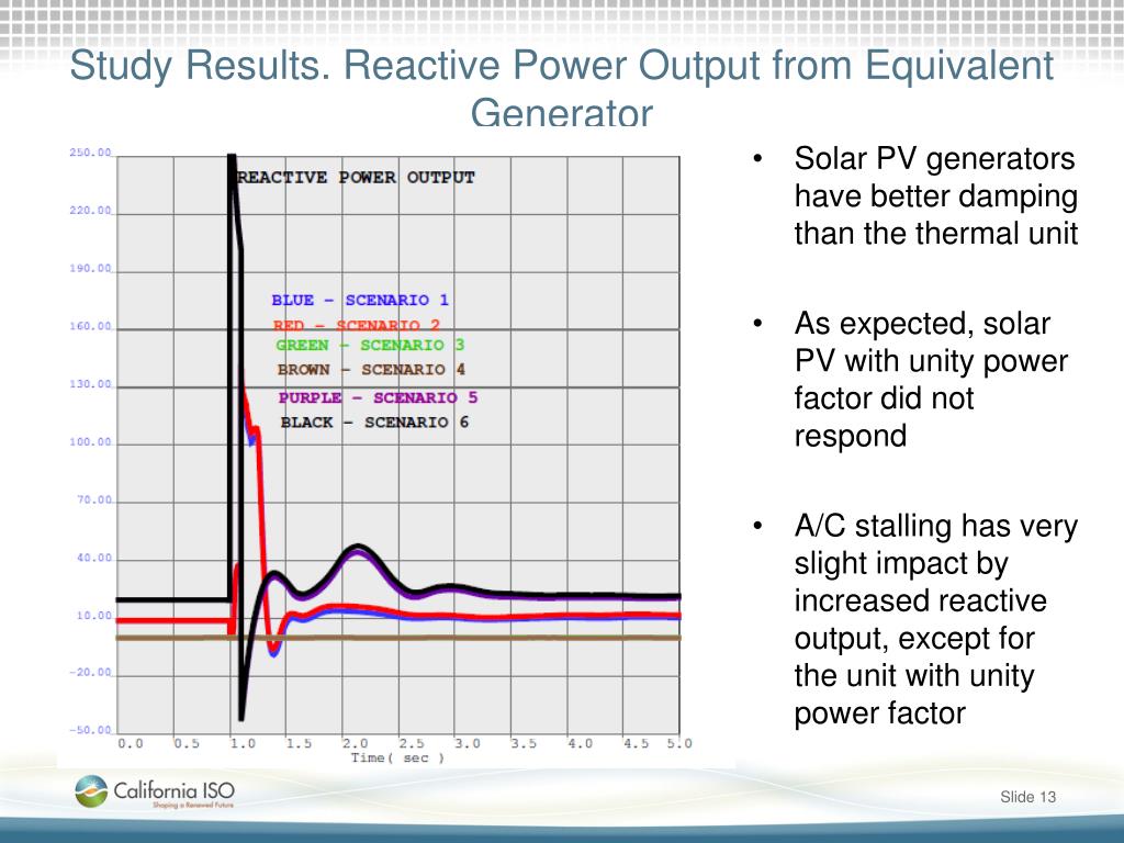 Study Results. Reactive Power Output from Equivalent Generator • Solar PV generators have better damping than the thermal unit • As expected, solar PV with unity power factor did not respond • A/C stalling has very slight impact by increased reactive output, except for the unit with unity power factor