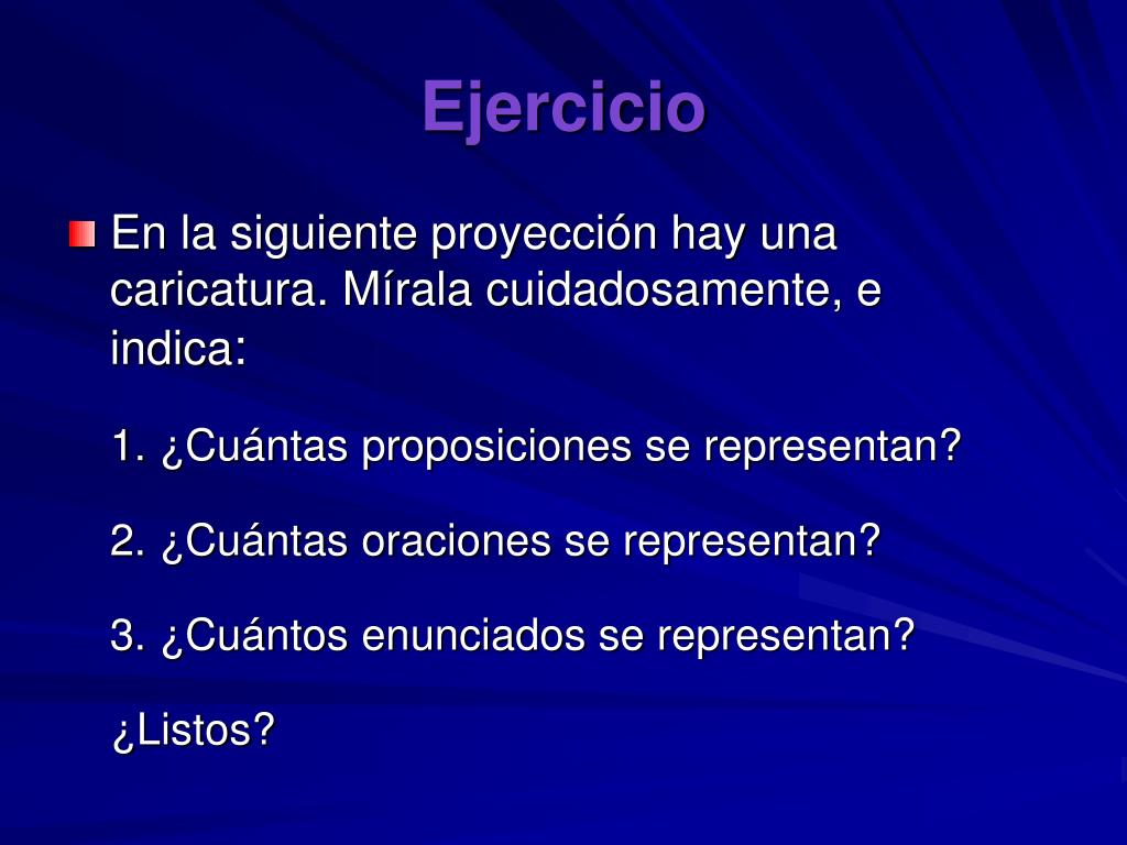 Ejercicio • En la siguiente proyección hay una caricatura. Mírala cuidadosamente, e indica: 1. ¿Cuántas proposiciones se representan? 2. ¿Cuántas oraciones se representan? 3. ¿Cuántos enunciados se representan? ¿Listos?