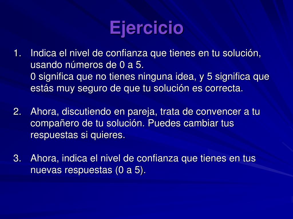 Ejercicio 1. Indica el nivel de confianza que tienes en tu solución, usando números de 0 a 5. 0 significa que no tienes ninguna idea, y 5 significa que estás muy seguro de que tu solución es correcta. 2. Ahora, discutiendo en pareja, trata de convencer a tu compañero de tu solución. Puedes cambiar tus respuestas si quieres. 3. Ahora, indica el nivel de confianza que tienes en tus nuevas respuestas (0 a 5).