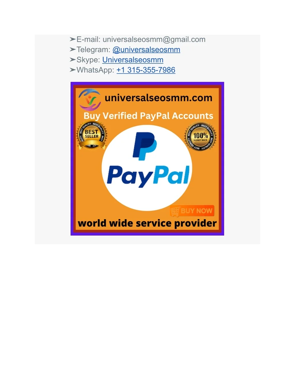 Buy Verified PayPal Accounts 24 Hours Reply/Contact ➤E-mail: universalseosmm@gmail.com ➤Telegram: @universalseosmm ➤Skype: Universalseosmm ➤WhatsApp: +1 315-355-7986 PayPal is one of the most established and widely used digital payment systems. It is an online financial service that allows you to pay for products through a secure account on the Internet. PayPal offers consumers more ways to shop online and send and receive money.
