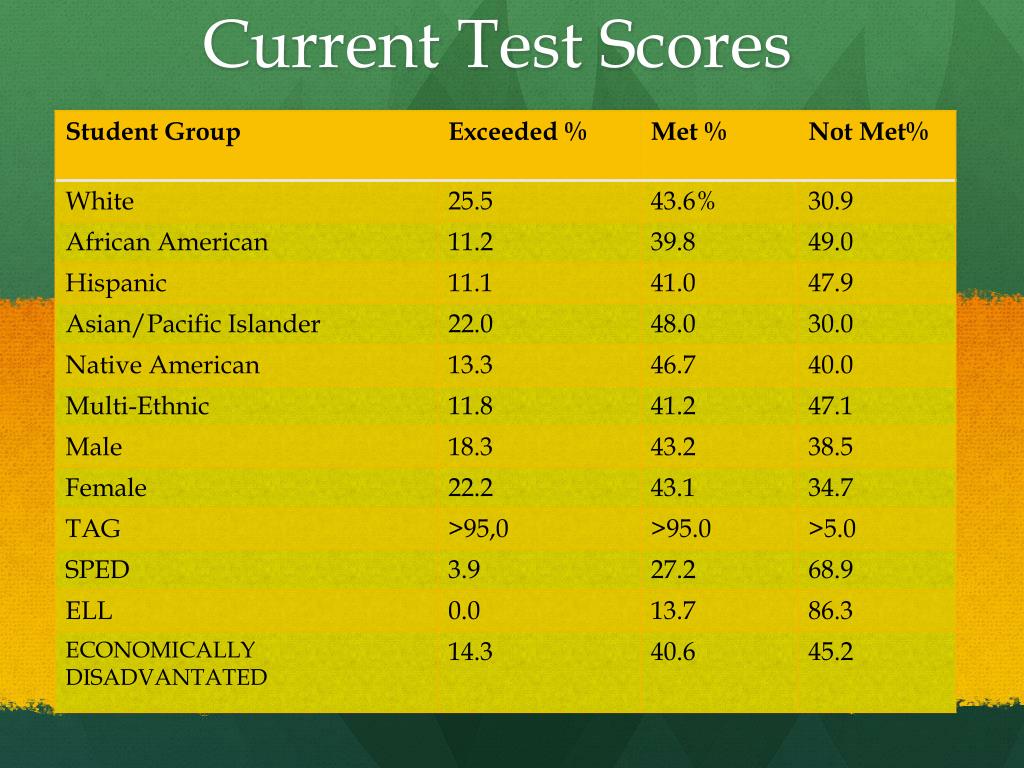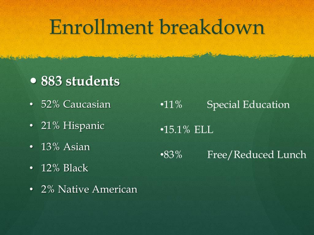Enrollment breakdown • 883 students • 52% Caucasian • 21% Hispanic • 13% Asian • 12% Black • 2% Native American • 11% Special Education • 15.1% ELL • 83% Free/Reduced Lunch