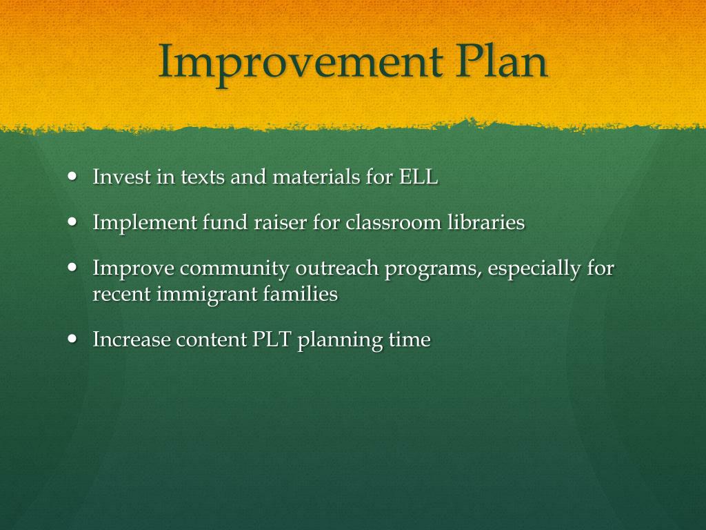 Improvement Plan • Invest in texts and materials for ELL • Implement fund raiser for classroom libraries • Improve community outreach programs, especially for recent immigrant families • Increase content PLT planning time